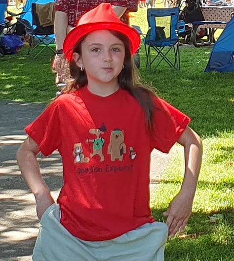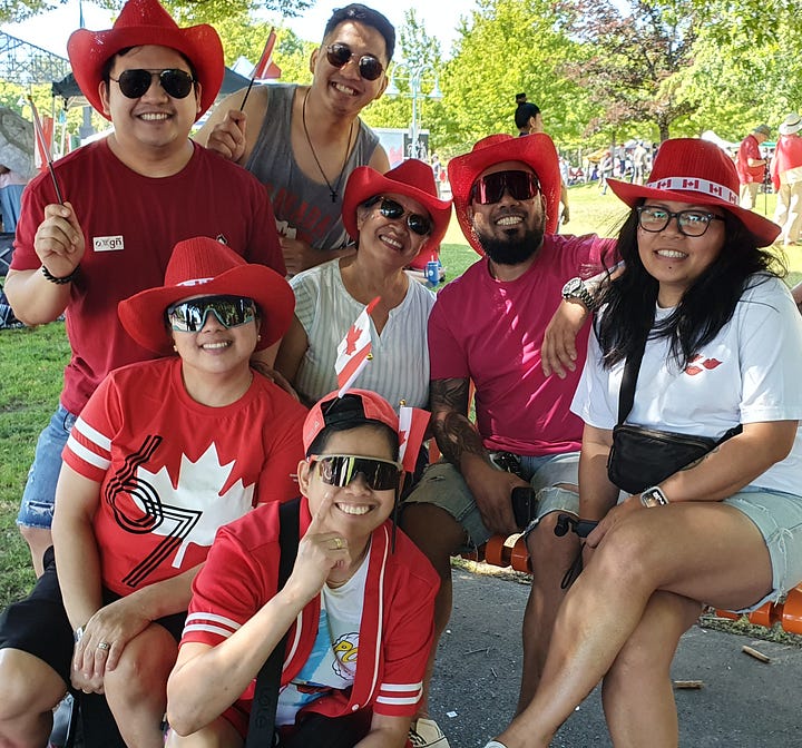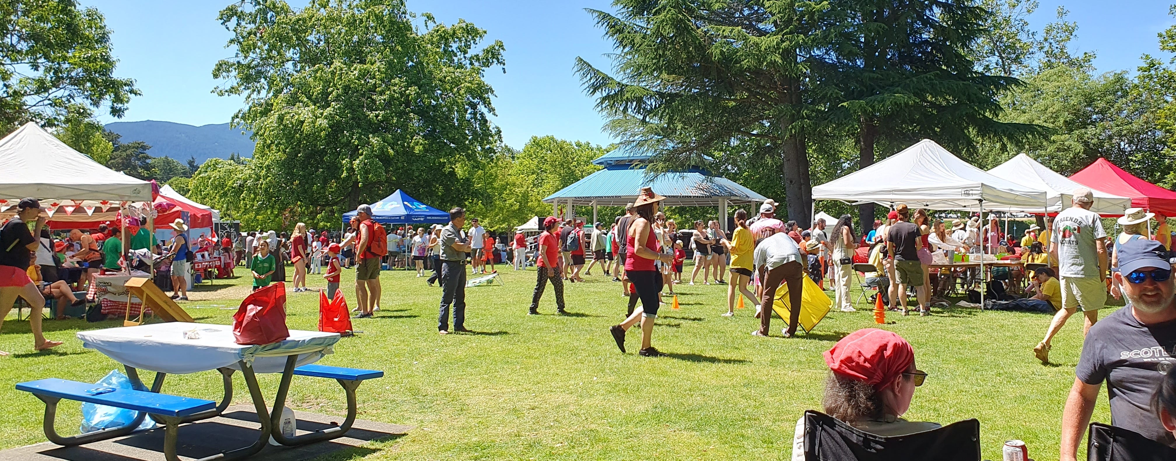 A narrow, slightly curved bridge with white railings connects the two halves of the park. Many revelers have made themselves comfortable on the grass, and many have brought their camping chairs with them. Dance groups and music bands perform on two stages. All around, there is a sea of red and white: dresses, pants, T-shirts, and hats in the Canadian national colors. Many have pinned small cardboard flags with the red maple leaf in the center to their hats, while others proudly carry a national flag in their hands or drape it around their shoulders.