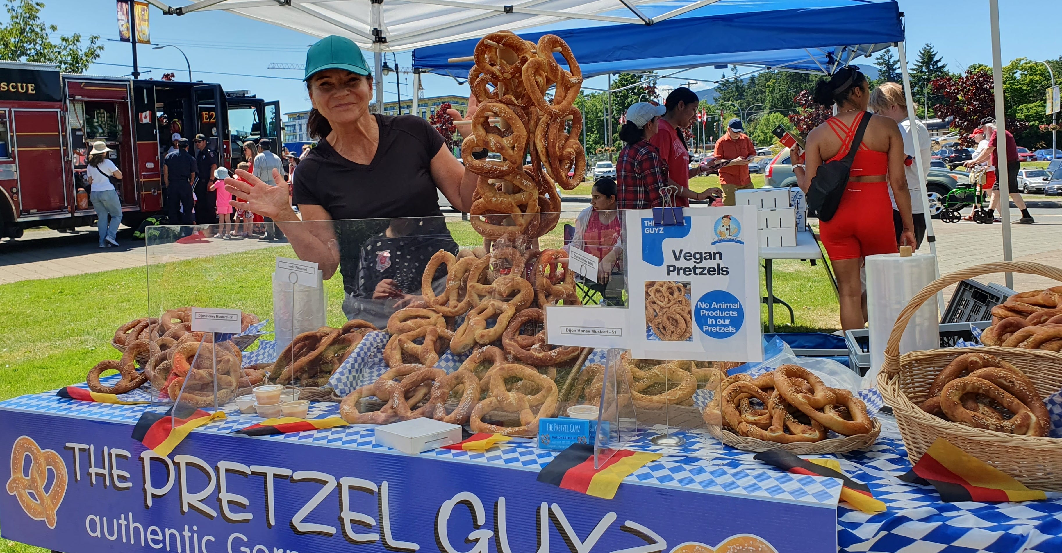 With so much love for one's homeland on display, I am moved when, amid all the red and white, I discover Monika from Frankfurt on the river Main selling “authentic German pretzels” at a stand. And what's more, she is serving them on a tablecloth and with napkins in the sky blue and white diamond pattern of the Bavarian flag. So much home away from home! It's almost too much to bear. LOL.