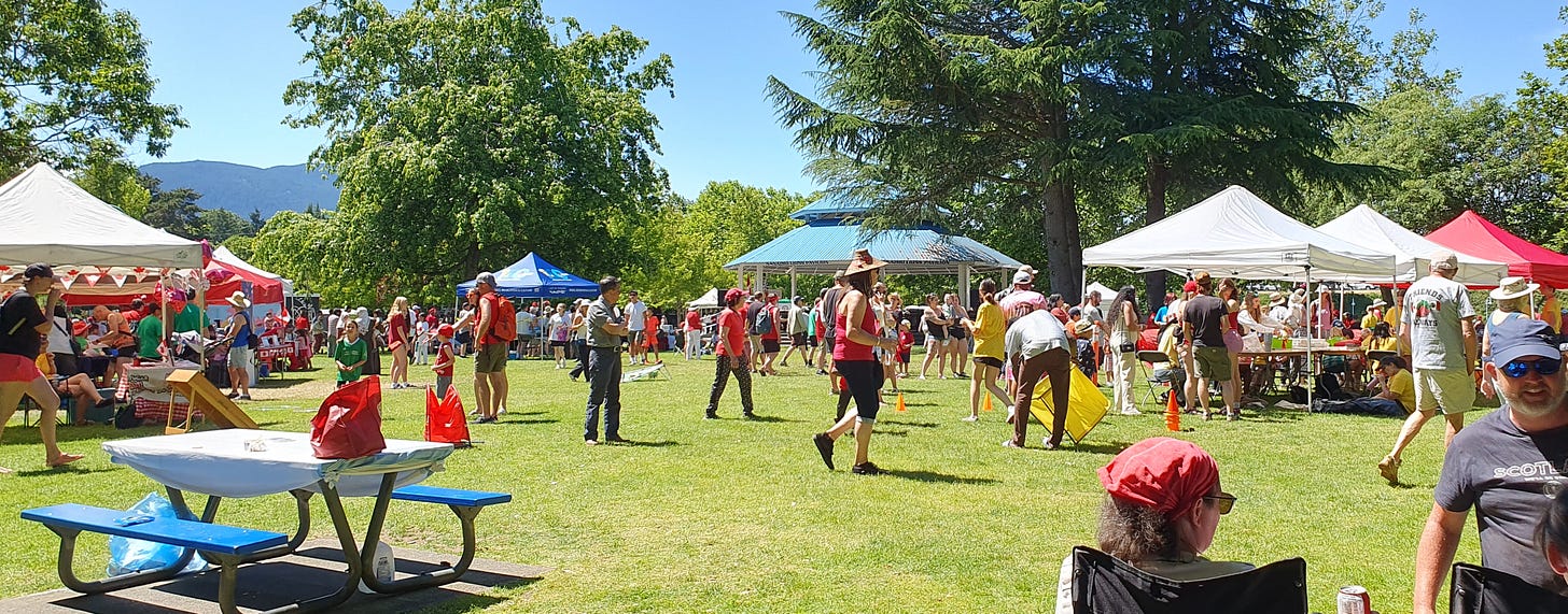 Like Americans on July 4, most Canadians celebrate their national holiday outdoors in bright sunshine. In Nanaimo, celebrations take place in Maffeo Sutton Park, which is located next to the small idyllic harbor. I stroll along the quay. In the distance, I can see the chain of hills on the mainland near Vancouver. That's where the water taxi comes from, which has just landed at the pier in the harbor